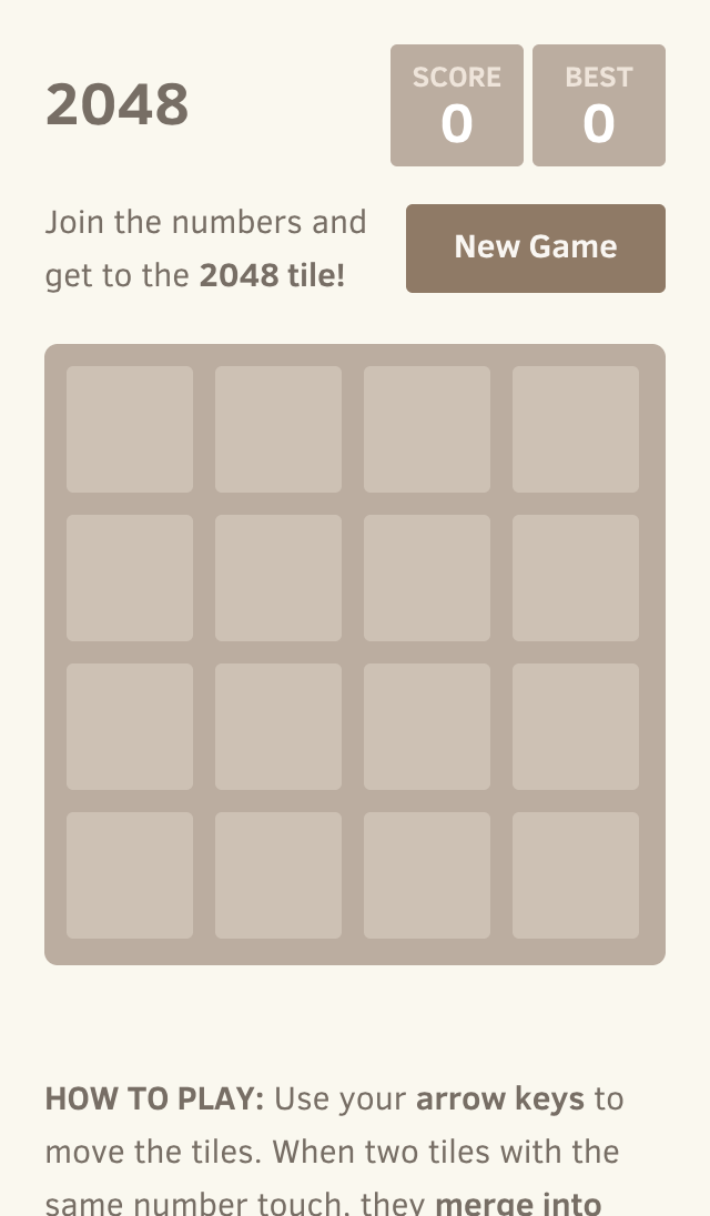 How to play: In the game of 2048, use your arrow keys to move the tiles. When two tiles with the same number touch, they merge into one!. Your ultimate objective is to strategically merge these tiles and reach the elusive tile with the number 2048, a challenging numerical milestone in this engaging puzzle game.